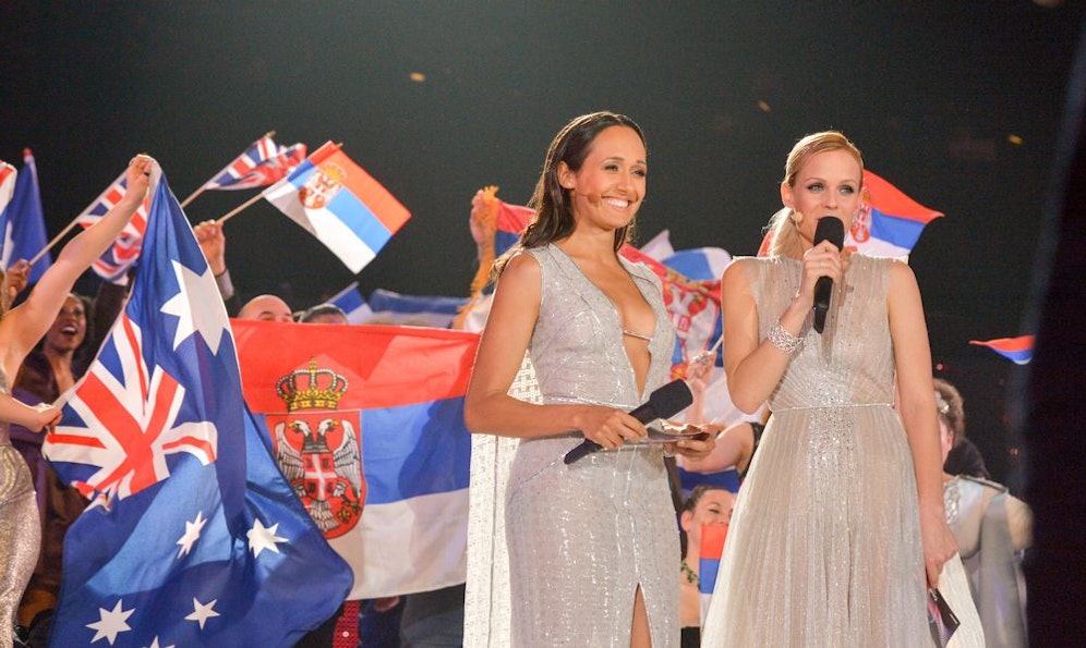 Vor der Abstimmung zogen sich die Moderatorinnen noch einmal um. Zum Finale der bombastischen Darbietung in Wien geizte Tumler dann nicht mehr mit ihren Reizen.