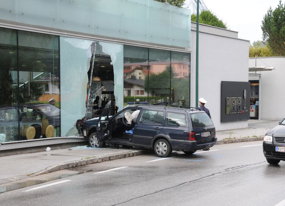Skurriler Unfall im Tiroler Bezirk Kufstein: Am Dienstag wurde um 16 Uhr ein Alkolenker mit 1,6 Promille in einer Kurve am Steuer ohnmächtig. Sein Auto krachte daraufhin frontal in eine Auslage - des bekannten Weinglasherstellers Riedel Glas.
