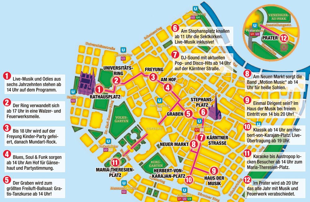Wer in der Wiener City das neue Jahr feiern und auf 2015 anstoßen will, kommt am Silvesterpfad so gut wie nicht vorbei. Bei der 25. Ausgabe werden auf zwölf Bühnen zahlreiche Highlights für jeden Musikgeschmack geboten. Auf "Heute.at" finden Sie das gesammelte Programm.