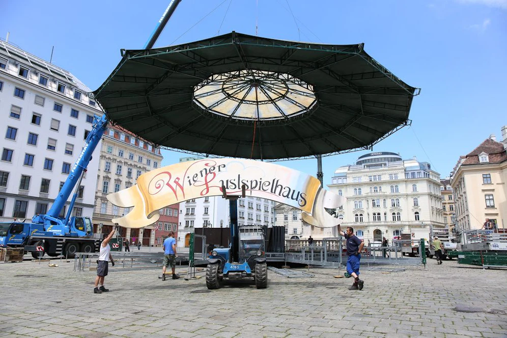 Dachgleiche am Hof: Am Dienstag wurde mitten in der City das Wiener Lustspielhaus aufgebaut. 2015 soll es wieder lustig werden. Diesmal nehmen Adi Hirschal und seine Schauspieler Shakespeares "Hamlet" nicht ganz so ernst.