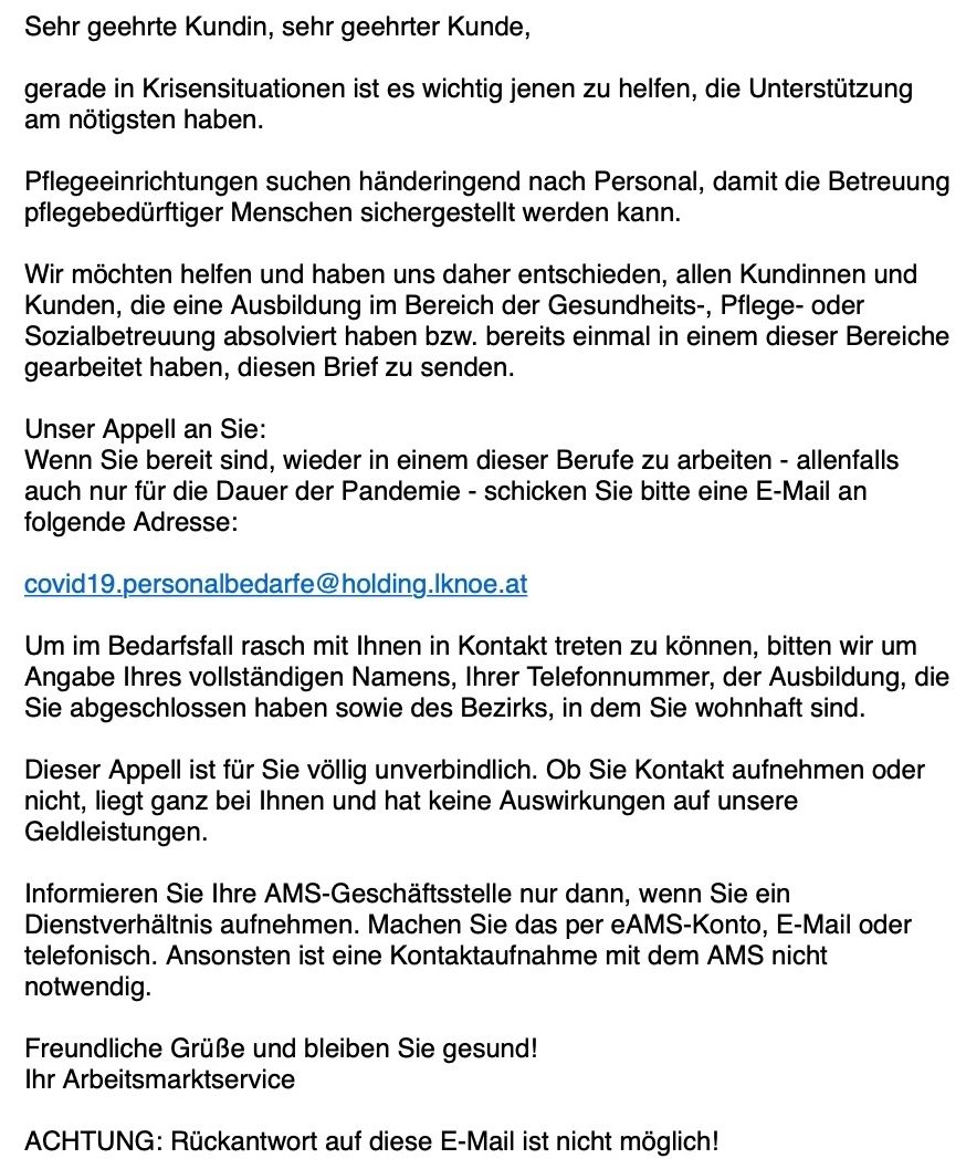 Der Hintergrund: "Pflegeeinrichtungen suchen händeringend nach Personal, damit die Betreuung pflegebedürftiger Menschen sichergestellt werden kann." Das AMS möchte angesichts dieser Situation helfen, "wir haben uns daher entschieden, allen Kundinnen und Kunden, die eine Ausbildung im Bereich der Gesundheits-, Pflege- oder Sozialbetreuung absolviert haben bzw. bereits einmal in einem dieser Bereiche gearbeitet haben, diesen Brief zu senden".