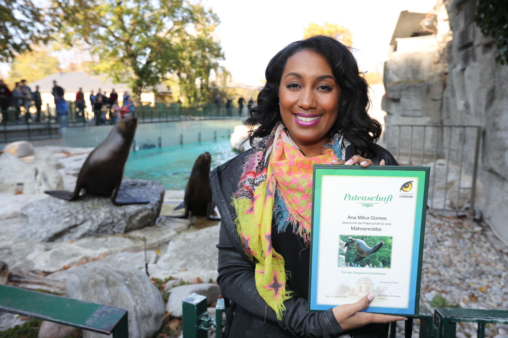 Montagnachmittag war es endlich so weit - beim Robbenbecken im Zoo Schönbrunn wurde Ana Milva Gomez die Urkunde zur Patenschaft für eine der Mähnerobben überreicht.