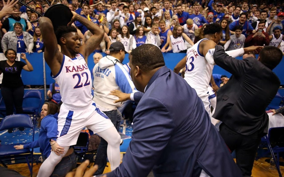 In den letzten Sekunden des College-Duells wollten die Jayhawks ihren klaren Sieg locker nach Hause spielen, als DeJuan Gordon noch einmal punkten wollte. Zum Unmut von Silvio De Sousa. Der Jayhawks-Spieler blockte den Wurf. Danach ging es rund.