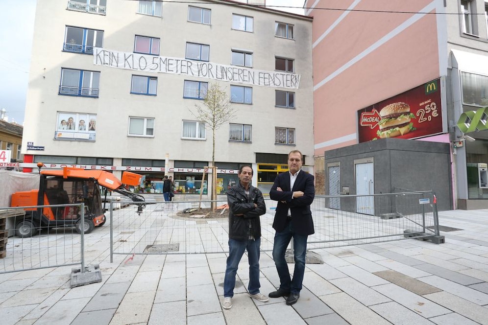 Was die Shopping-Fans auf der Einkaufsmeile freut, treibt Anrainer auf die Barrikaden. „Wir wohnen jetzt mit Blick auf das hässliche Betonklo, wurden nicht einmal gefragt. Wir können den Leuten dann beim Pinkeln zuschauen“, beschwert sich Tassilo Türk, einer von 18 direkten Anwohnern.