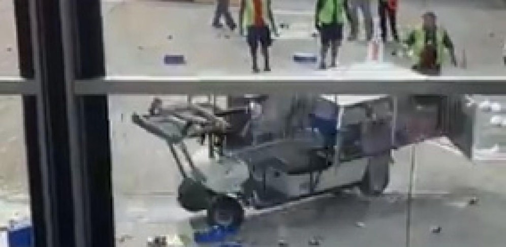 Ein Fluggast filmte das Fahrzeug von seinem Sitzplatz aus. Im Hintergrund ist ein Flughafen-Mitarbeiter zu sehen, der am Boden sitzt, möglicherweise wurde er beim Versuch, das Fahrzeug zu stoppen, verletzt.