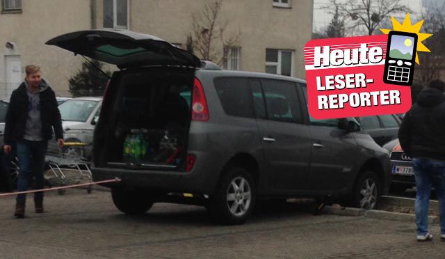 Am Parkplatz eines Supermarktes in Wien-Donaustadt beobachtete eine Leserin dieses Auto, wie es sich mit den Vorderrädern über den Randstein im Bankett eingeparkt hat. Ein zweites Auto versuchte verzweifelt den Wagen rauszuziehen.