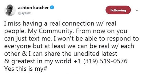 "Ich vermisse es, eine echte Verbindung mit echten Leuten zu haben. Meine Gemeinschaft. Ab sofort könnt ihr mir einfach Textnachrichten schreiben. Ich werde nicht allen antworten können, aber zumindest können wir echt miteinander sein und ich kann die nicht redigierten, tollsten Neuigkeiten aus meiner Welt teilen.", heißt es in dem Twitter-Beitrag.