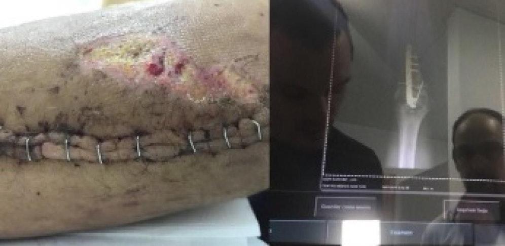 Das Foto seiner Wunde zeigt eine lange Narbe am Unterarm, die mit mindestens acht Metallklammern zusammengehalten wird.