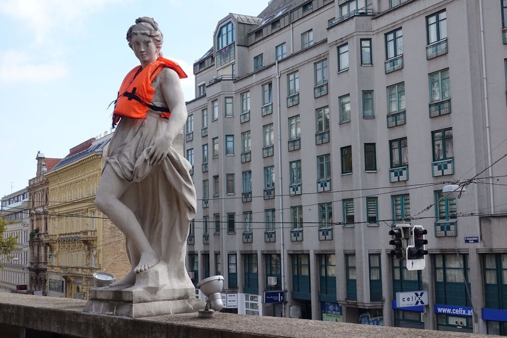 Basel, Bern, Zürich und jetzt auch Wien: Das Kollektiv "Politesse Publique" will mit Schwimmwesten jenen Menschen ein Denkmal setzen, die gezwungen waren, auf der Flucht nach Europa ihr Leben aufs Spiel zu setzen. Die orangen Westen seien Symbole der gesamtgesellschaftlichen Krise im Umgang mit flüchtenden Menschen, schreiben die Organisatoren in einer Aussendung.