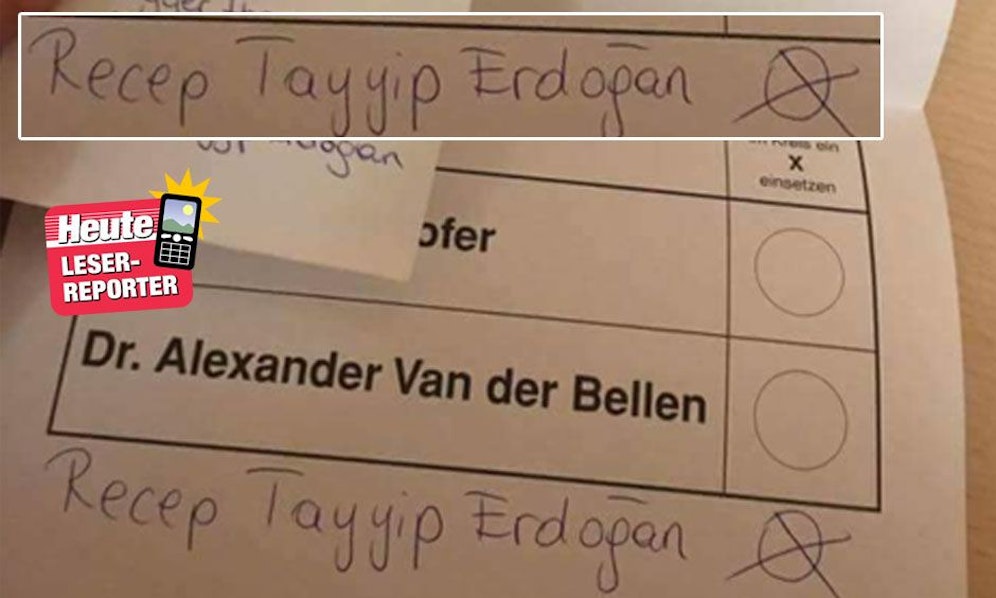 Das Kreuzerl wurde für den türkischen Präsidenten Recep Tayyip Erdogan gemacht, der handschriftlich unter Van der Bellen hinzugefügt wurde. Außerdem hält der Fotograf einen Zettel in das Foto.