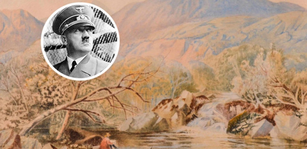 Wie die "Daily Mail" berichtet, hat sich Hitler im Aquarell "Alpenlandschaft" wohl selbst eingefügt. Bei dem Mann, der am Wasser sitzt, könnte es sich um den Diktator handeln. Belege für diese Theorie gibt es aber keine.