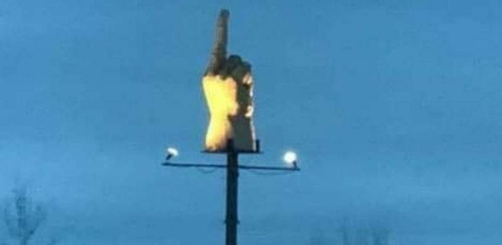Nach 10 Jahren hatte er jetzt die Nase voll und entschied, drastische Maßnahmen zu ergreifen um es den Behörden heimzuzahlen. So Pelkey er am 30. November eine gigantische Mittelfinger-Statue in seinem Garten auf, welche 320 Kilogramm schwer und 5 Meter hoch ist und somit über das ganze Dorf ragt. Zwei Flutlichter sorgen dafür, dass die Behörden auch in der Nacht an seine Wut erinnert werden.