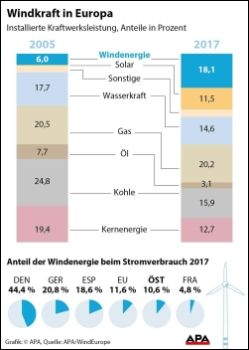 Die gesamte installierte Leistung aller Kraftwerke in der EU lag laut "WindEurope" bei 933.000 MW. Der größte Teil davon entfiel auf Gaskraftwerke (20,2 Prozent). Auf Rang zwei lagen die Windräder (18,1 Prozent), gefolgt von Kohlekraftwerken (15,9 Prozent), Großwasserkraft (14,6 Prozent) und Atomenergie (12,7 Prozent).