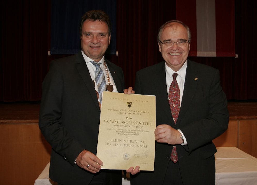 Feierlicher Festakt im Stadtsaal von Purkersdorf (Bezirk Wien-Umgebung) am Montag Abend: Bürgermeister Karl Schlögl (SP) überreichte im Zuge einer außerordentlichen Gemeinderatssitzung Justizminister Wolfgang Brandstetter den goldenen Ehrenring der Wienerwaldstadt.