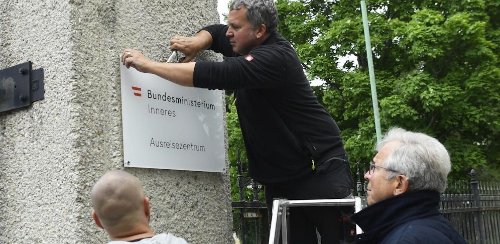 Der ehemalige Flüchtlingskoordinator Ferry Maier und ein Team der Plattform "Menschen.Würde.Österreich" haben am Donnerstag die "Ausreisezentrum"-Tafel bei der Erstaufnahmestelle für Asylwerber in Traiskirchen (Bezirk Baden) abmontiert. Sie wollten sie ins Innenministerium schicken, die Polizei nahm ihnen die Tafel jedoch wieder ab.
