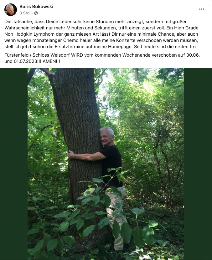 Der gebürtige Steirer, der seit langem in Wien-Stammersdorf lebt, sieht aber eine "minimale Chance" mittels Chemotherapie dem Krebs der "ganz miesen Art" den Kampf anzusagen. Seine Auftritte am 10. und 11. Juni in Fürstenfeld musste der studierte Jurist bereits auf kommendes Jahr verschieben, Ersatztermine für alle weiteren für heuer geplanten Konzerte sollen noch folgen.