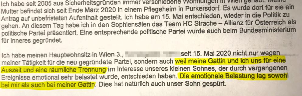 "Ich habe meinen Hauptwohnsitz in Wien 3 [...] seit 15. Mai 2020 nicht nur wegen meiner Tätigkeit für die neu gegründete Partei, sondern auch weil meine Gattin und ich uns für [...] eine räumliche Trennung im Interesse unseres kleinen Sohnes [...] entschieden haben", gibt Heinz-Christian Strache der Wahlkommission Wien-Landstrasse zu Protokoll. Grund für die "Auszeit" sei die emotionale Belastung durch die Ereignisse der vergangenen Wochen und Monate.