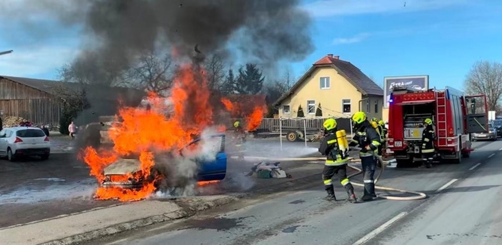 Bei erhöhter Warnstufe rückten gleich zwei Feuerwehren zum Löschen aus. Obwohl die Florianis in rekordverdächtiger Zeit unter Atemschutz am Einsatzort mit dem Löschen begannen, war vom Auto nicht mehr viel zu retten.