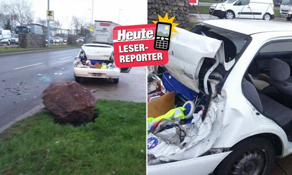 Das weiße Auto war in der Früh auf dem Rautenweg in Richtung stadtauswärts unterwegs. Ein Lastwagen prallte mit voller Wucht gegen das Heck. Daraufhin wurde der Wagen noch gegen einen neben der Straße liegenden Fels geschleudert.