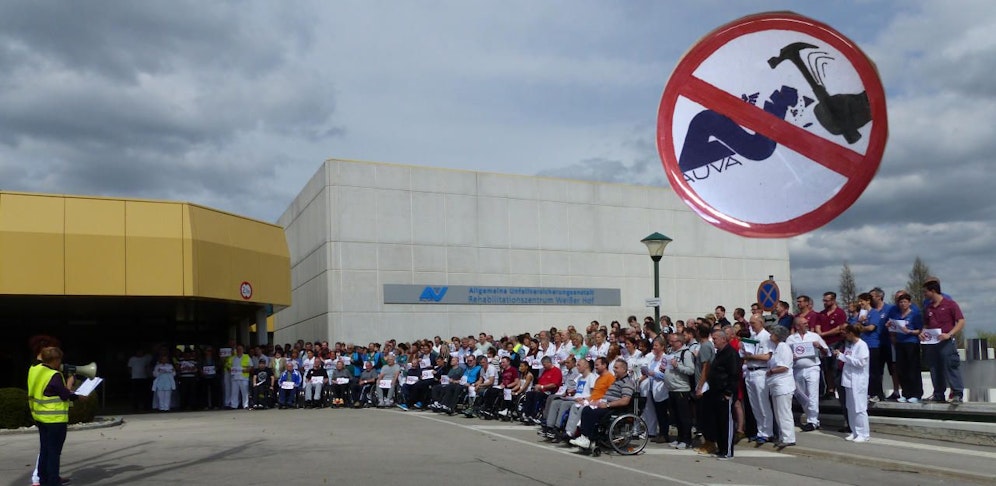 250 der rund 330 Mitarbeiter des AUVA-Rehabilitationszentrums "Weißer Hof" in Klosterneuburg machten ihrem Unmut über die Pläne der Regierung Luft.