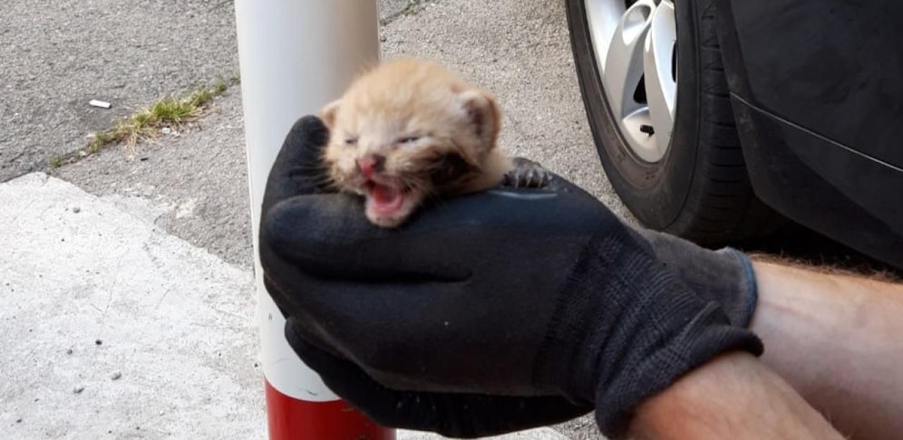 Die zwei Pannenhelfer vom Prüfzentrum Ottakring hoben das Fahrzeug mit dem Wagenheber an, entfernten die untere Motorabdeckung und fanden das verängstigte Kätzchen zusammengekauert unter der Frontverkleidung.