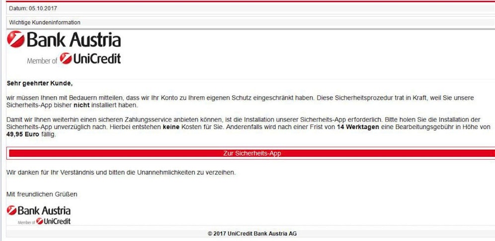 Um die Empfänger unter Druck zu setzen, wird mit einer angeblichen Gebühr von rund 50 Euro innerhalb einer Frist von 14 Tagen gedroht. "Vorsicht - neuer Phishingversuch! Diese E-Mail ist gerade im Umlauf und stammt NICHT von der Bank Austria. Bitte löschen Sie die Nachricht umgehend. Sollten Sie bereits auf den Link geklickt oder Ihre Daten eingegeben haben, kontaktieren Sie bitte sofort unsere OnlineBanking Hotline via 050505-26100", heißt es von der Bank Austria.