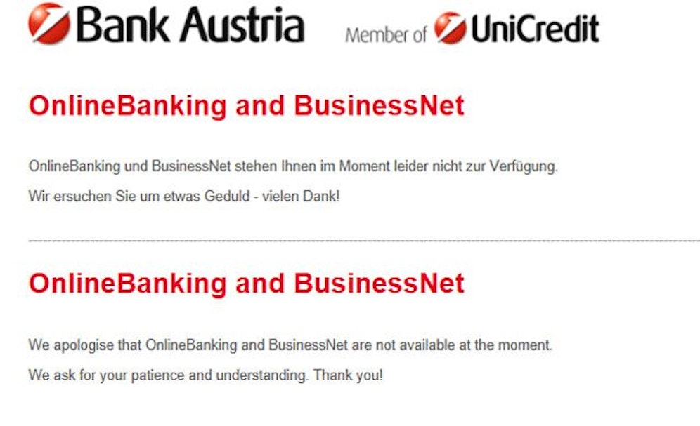 Derzeit kämpft die Bank Austria wieder mit einem Ausfall ihres Onlinebanking-Moduls. Ein Sprecher der Bank nannte einen Softwarefehler als Ursache. Wann die Kunden wieder auf die Seite zugreifen können, ist derzeit unklar.