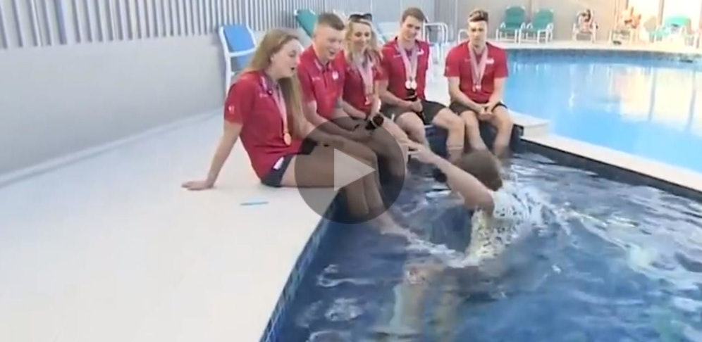 Pech für den BBC-TV-Reporter: Er hatte während des Interviews mit dem Schwimmteam eine Stufe im Pool übersehen und landete plötzlich bis zum Hals im Wasser.