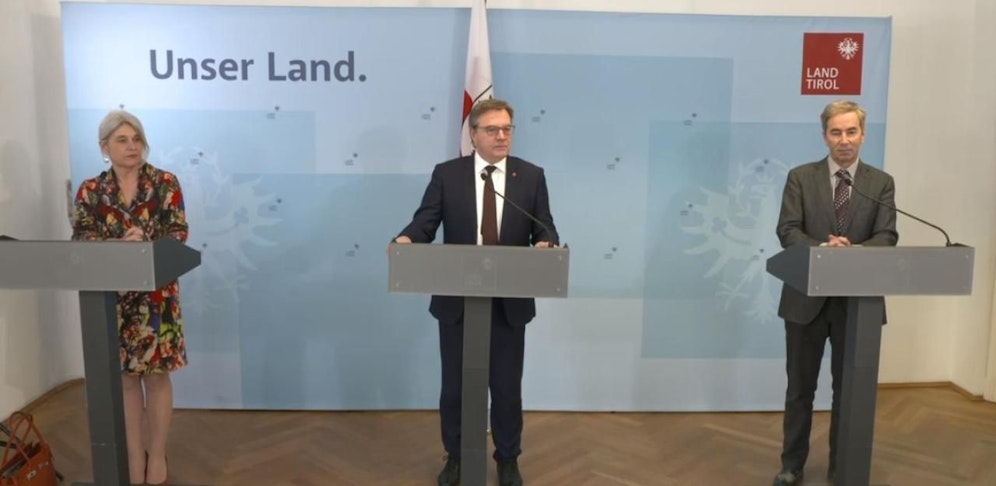 In einer Pressekonferenz per Videoschaltung haben der Tiroler Landeshauptmann Günther Platter (ÖVP), der Direktor für Innere Medizin der Klinik Innsbruck, Günther Weiss sowie die Mikrobiologin Cornelia Lass-Flörl die neuen Infizierten-Zahlen für Tirol mitgeteilt.