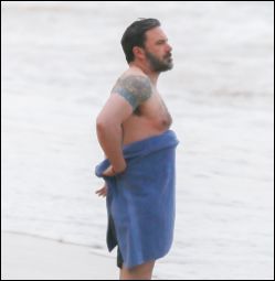 Leider geht Affleck nicht allzu klug mit der Situation um. Beim Baden in der Brandung versucht er krampfhaft, seinen Bauch einzuziehen, wenn er am Strand steht, wickelt er sich ein blaues Handtuch um die Brust, um den Bauch zu verstecken.