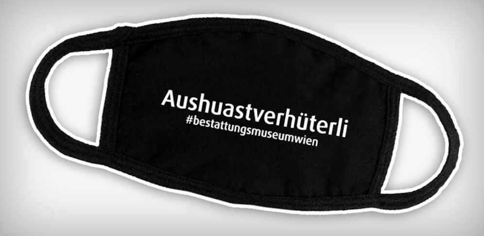 Aus aktuellem Anlass wurden nun auch ein Mund-Nasen-Schutz (MNS) ins Sortiment aufgenommen. Das "Aushuastverhüterli" des Bestattungsmuseums Wien ist natürlich ganz in Tiefschwarz ("was sonst") gehalten, genauso wie der humorige Aufdruck. Nach eigenen Angaben ist die urige Maske aus recyceltem PET-Stoff hergestellt und bei rund 60 Grad waschbar. Sie kann also mehrmals getragen werden.