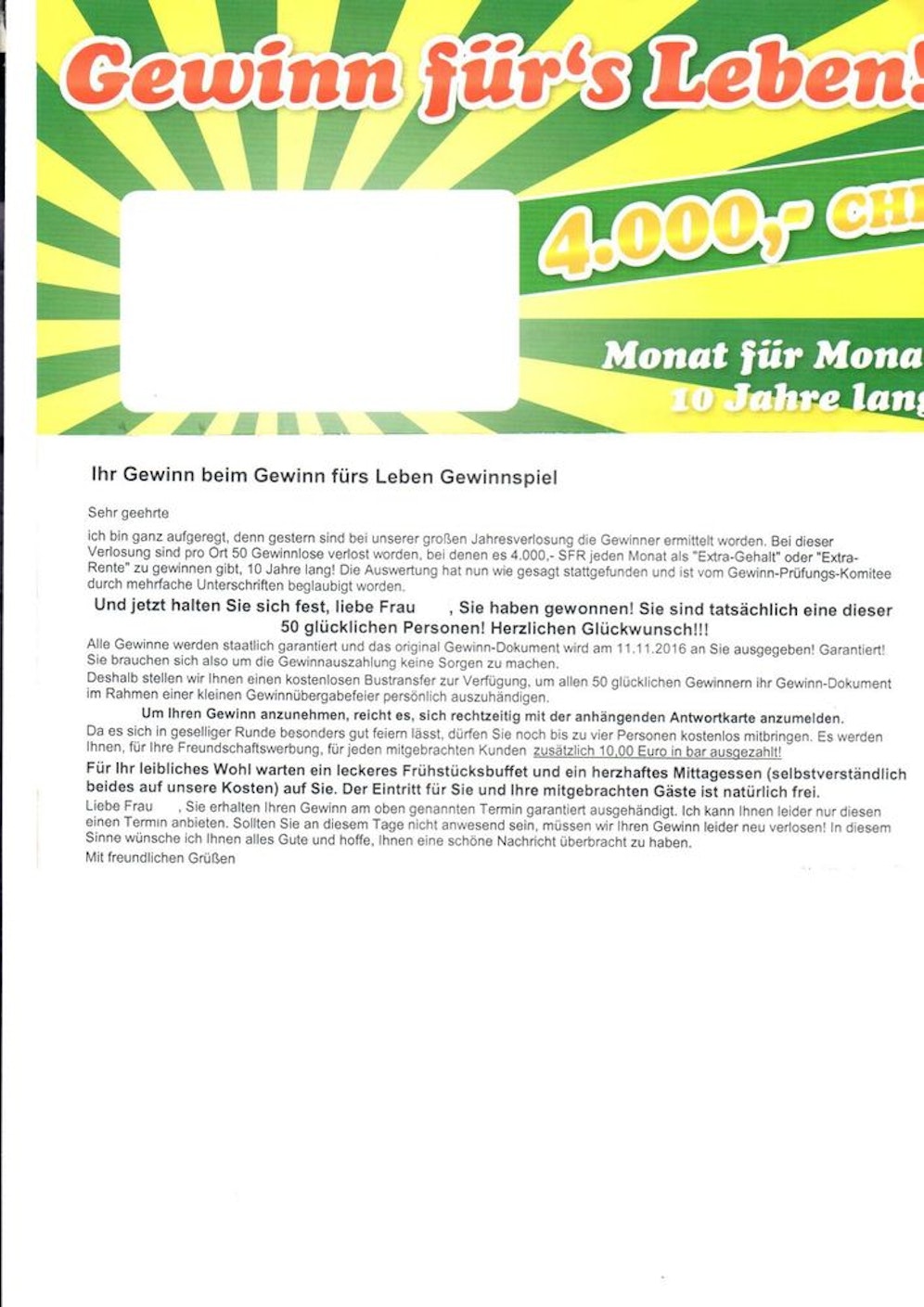 Der Folder mit dem Titel "Gewinn für's Leben" hat es in sich: "Sie haben gewonnen! Herzlichen Glückwunsch!!!", heißt es da. Die Aussicht nach einem höheren Geldgewinn verleitete daher eine Pensionistin aus Gablitz sich zu einer Busfahrt mit Gewinnversprechen anzumelden. "Alle Gewinne werden staatlich garantiert", heißt es vollmundig.