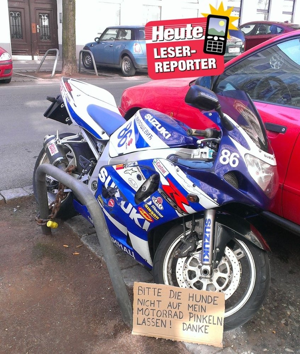 "Bitte die Hunde nicht auf mein Motorrad pinkeln lassen! Danke", steht auf einem Pappschild neben dem Feuerstuhl. Ob es geholfen hat oder nicht, ist nicht bekannt. Zumindest das Schild dürfte jedenfalls sauber geblieben sein.