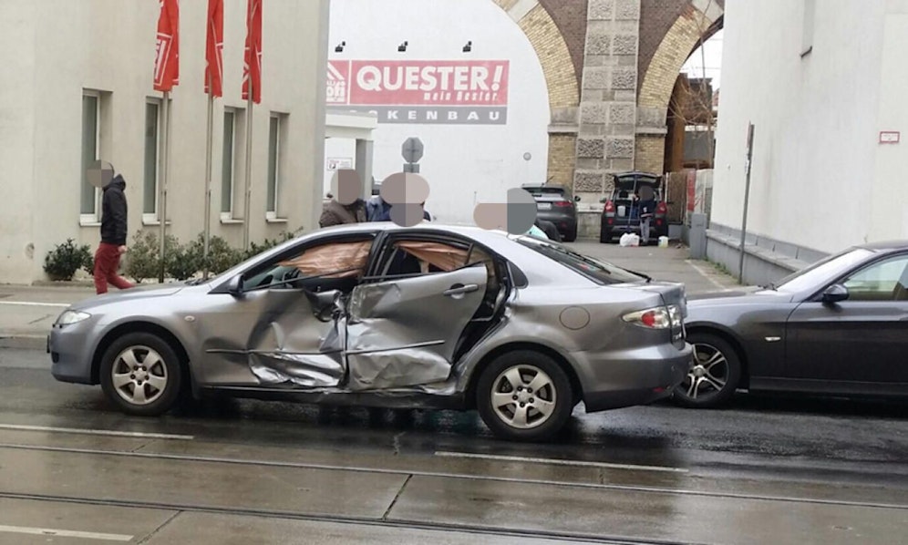 Ein Lenker versuchte, seinen Wagen zu wenden und hatte dabei die herannahende Straßenbahn der Linie D übersehen. Die Straßenbahn erfasst den Mazda, der Beifahrer im Auto wurde verletzt. Krankenhauspersonal eilte sofort zur Hilfe.