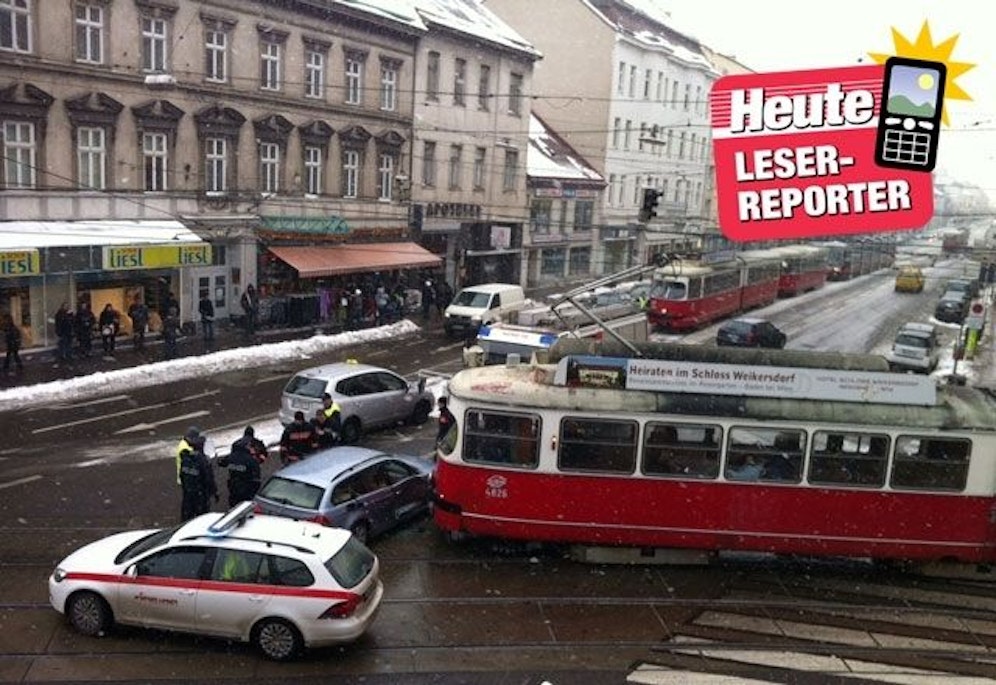 Mit einem Blechschaden endete am Donnerstag eine Kollision auf dem Floridsdorfer Spitz. Eine Straßenbahn-Garnitur stieß etwa um 13:30 Uhr mit einem BMW-Kombi zusammen. Leserreporter Andreas Ring hörte an seinem Arbeitsplatz "einen heftigen Zusammenprall". Als er nachsah, wurde die Vermutung bestätigt und Ring fotografierte den Unfallort.
