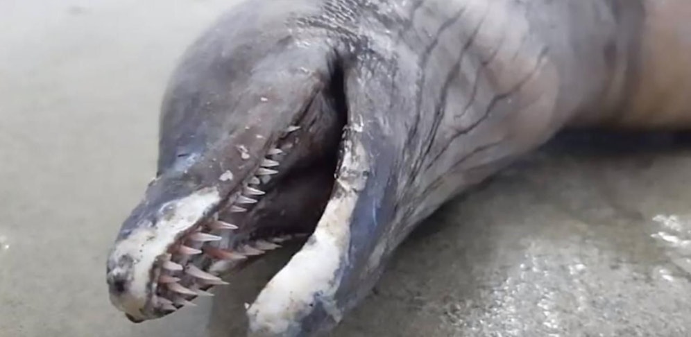 Ist es ein Delfin? Oder eine Meeresschlange? Schockierte Einheimische haben am Strand von Destiladeras (Mexiko) eine seltsame, augenlose Kreatur gefunden.