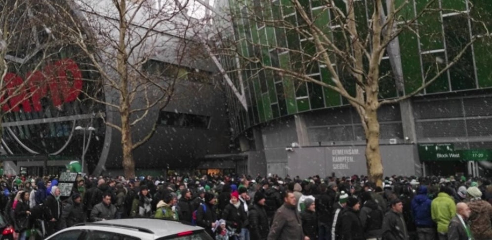 Die Rapidler müssen lange vor dem Stadion frösteln. Wegen strenger Kontrollen vor dem Block West geht es nur zähflüssig vorwärts. Einlass war um 15 Uhr.