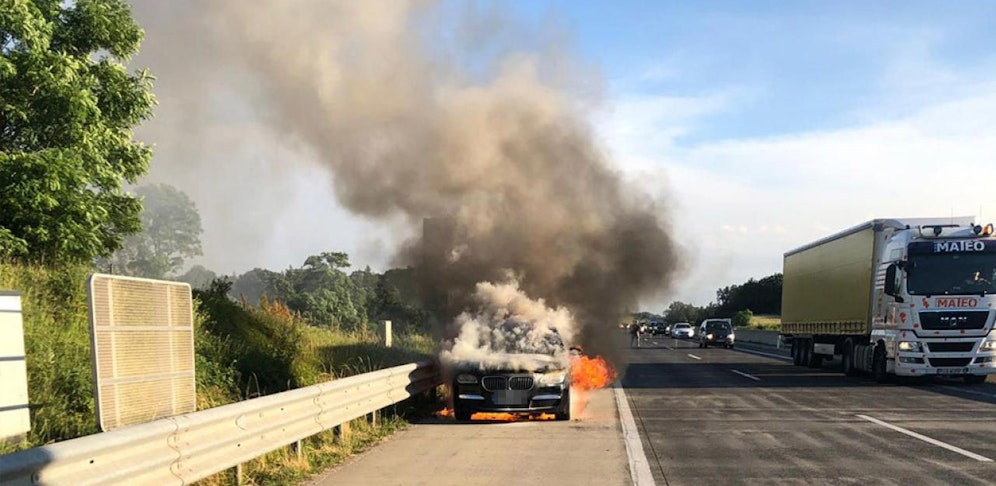 Ein BMW fing während der Fahrt plötzlich Feuer, der Lenker konnte den Wagen noch geistesgegenwärtig auf den Pannenstreifen lenken und sich in Sicherheit bringen.