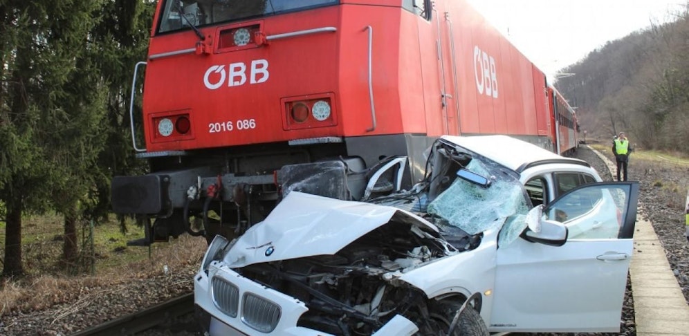 Ein herannahender ÖBB-Regionalzug mit vier Waggons und 56 Insassen konnte trotz eingeleiteten Bremsvorganges die Kollision mit dem Auto nicht verhindern.