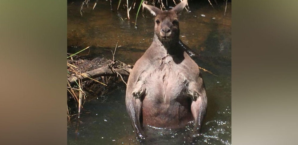 In einem Flusslauf nahe Margaret River im Westen Australiens trafen der 27-Jährige und sein treuer Vierbeiner auf ein riesiges Känguru. "Ich bin hinunter gelaufen um ein Foto meines Hundes zu schießen... als ich mich umdrehte saß da ein Känguru im Fluss", berichtet der Australier gegenüber "ABC".