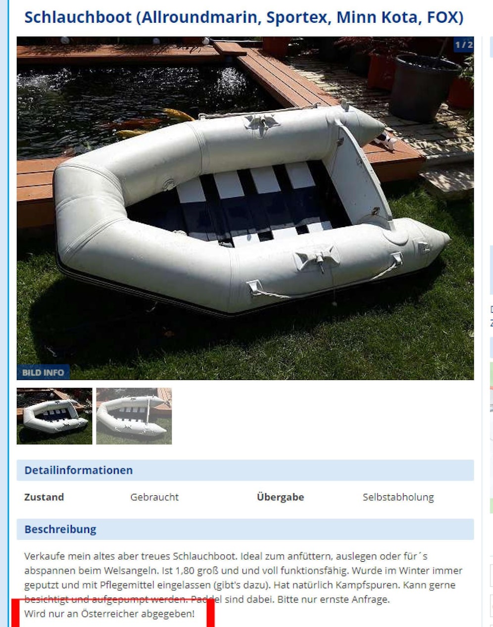 Auf dem virtuellen Marktplatz "Willhaben" entdeckte "Heute"-Leser Manuel eine diskriminierende Anzeige. Der Anbieter verkauft hier sein "altes, aber treues Schlauchboot (Allroundmarin, Sportex, Minn Kota, FOX)" um 180 Euro.