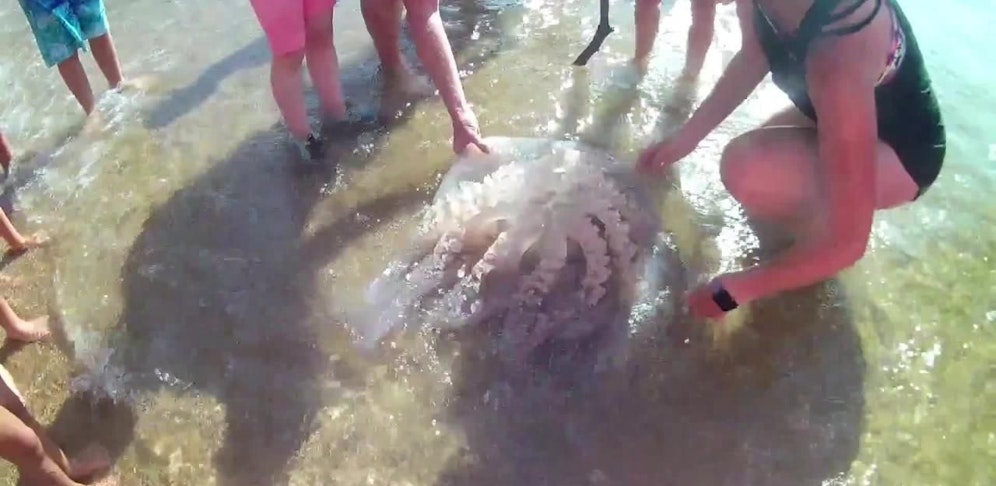 Die Strand-Besucher versuchten die Riesen-Qualle daraufhin wieder ins Meer zu schieben, doch nur wenig später wurde das Tier erneut angespült und verendete.
