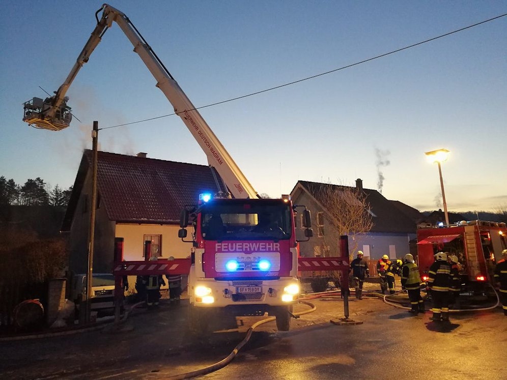 Brand Mittwochmorgen in Ebenthal (Gänserndorf): In einem Wohnhaus brach plötzlich Feuer aus, vier Menschen - ein Erwachsener und drei Kinder - konnten rechtzeitig ins Freie flüchten. Neun Feuerwehren standen mit 75 Mann stundenlang im Löscheinsatz.