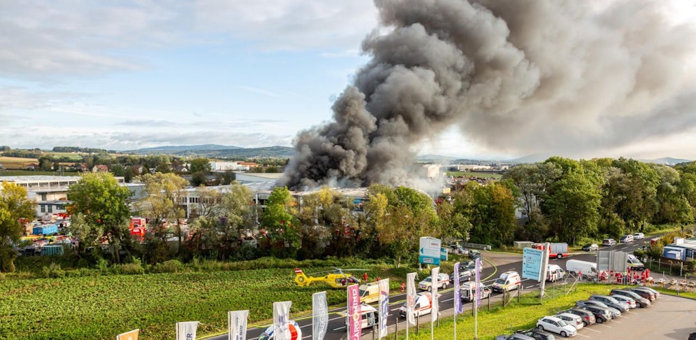Nach einer heftigen Explosion in einer Entsorgungsfirma in Hörsching kämpfen 17 Feuerwehren gegen die Flammen. Der Brand ist aktuell unter Kontrolle.