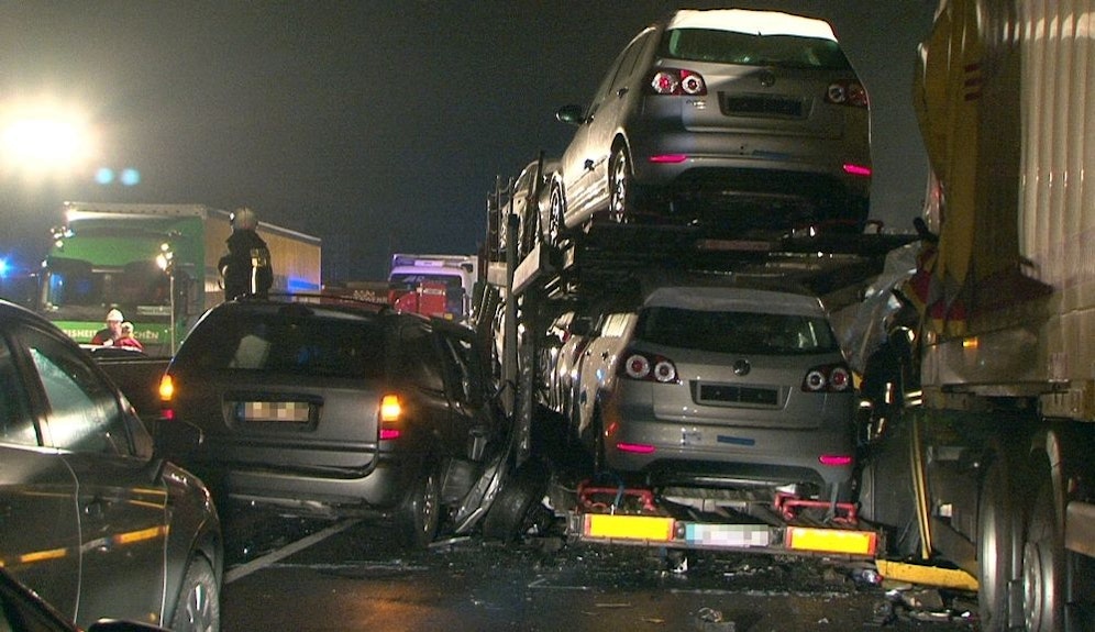 Unter einer Brücke waren in der Nacht auf Dienstag Plastikrohre in Brand geraten. Der dichte Rauch nahm den Autofahrern die Sicht, sechs Laster und 15 Personenwagen krachten ineinander. "Wir gehen aufgrund der Umstände davon aus, dass wir eine Brandstiftung haben müssen", sagte Polizeisprecher Andreas Czogalla.