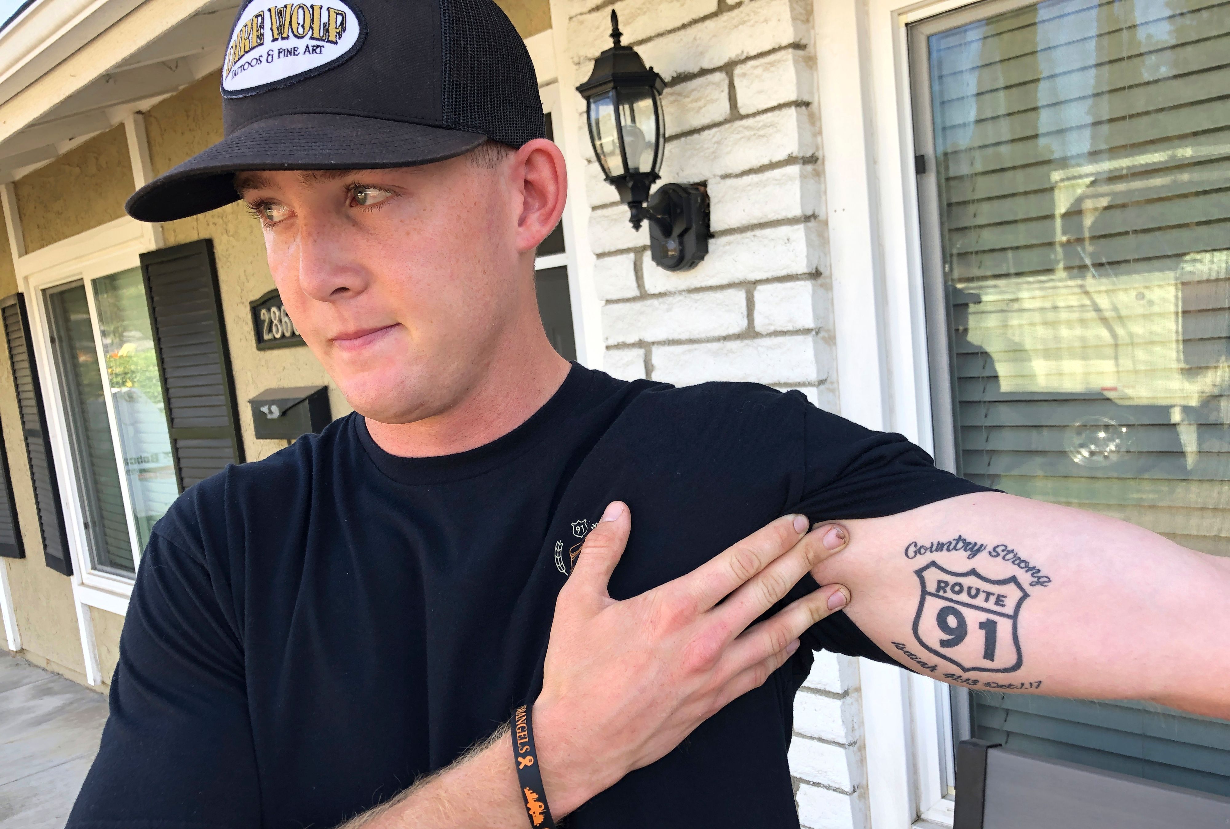 Brendan Kelly zeigt sein "Route 91"-Tattoo.