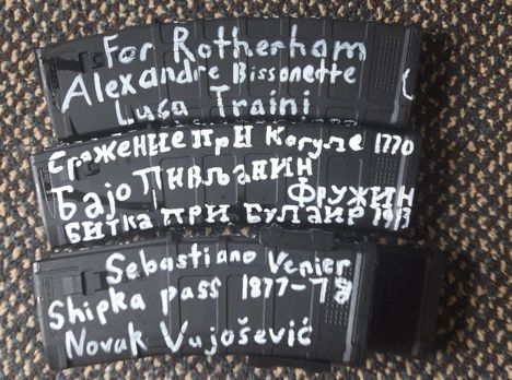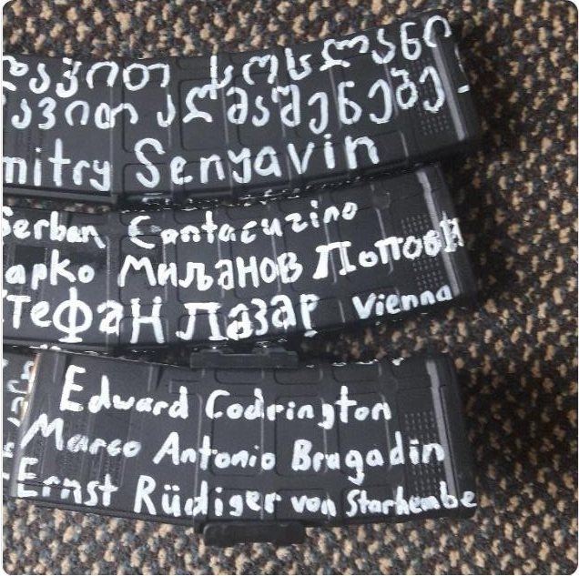 Auf seinen Waffen und auf seiner Munition hatte er mit weißer Farbe Namen geschrieben. So gut wie alle aufgelisteten Personen haben gegen Türken gekämpft, einige davon in Wien.