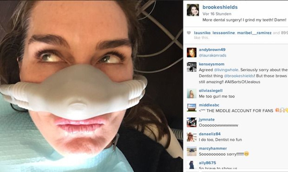 So also schaut ein Hollywood- Star beim Zahnarzt aus! Brooke Shields (49) brauchte eine Spezialbehandlung, weil sie nachts mit ihren Zähnen knirscht. "Verdammt", ärgert sich die Schauspielerin via Instagram.