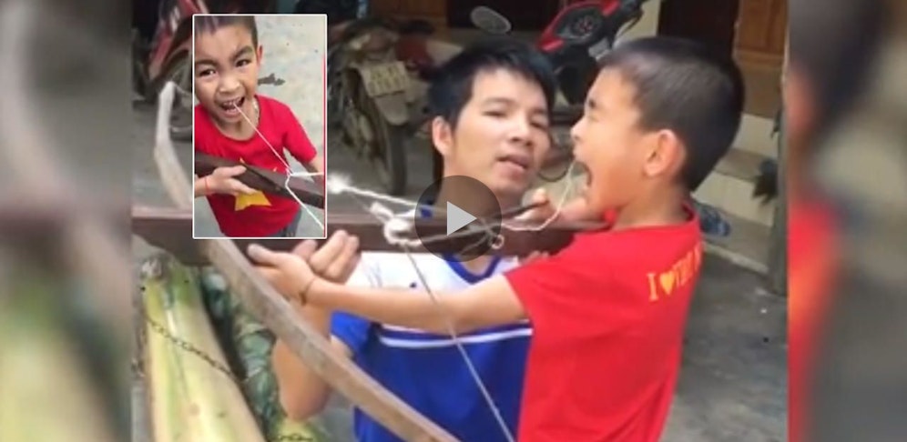 Dieser Bursche aus Thailand zeigt, wie man sich seiner Milchzähne auf die abenteuerliche Art entledigt.