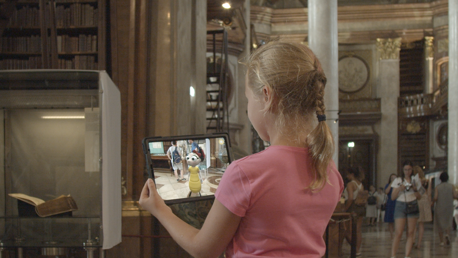 Coole Technik in altehrwürdigen Hallen: Die Österreichische Nationalbibliothek setzt nun erstmals Augmented Reality ("erweiterte Realität") im Bereich der Kulturvermittlung ein – und zwar im Rahmen einer neuen Familienführung durch den Prunksaal. Dabei bekommen die Teilnehmer von ihrem Guide ein Tablet überreicht, durch das sie den Prunksaal wie durch ein Fenster betrachten können. An insgesamt sechs Punkten des Raums werden ihnen dann in das "Fenster" Szenen einer Geschichte eingespielt, die drei kleine, wissbegierige Bücherwürmer zwischen den Regalen der Bibliothek erleben.